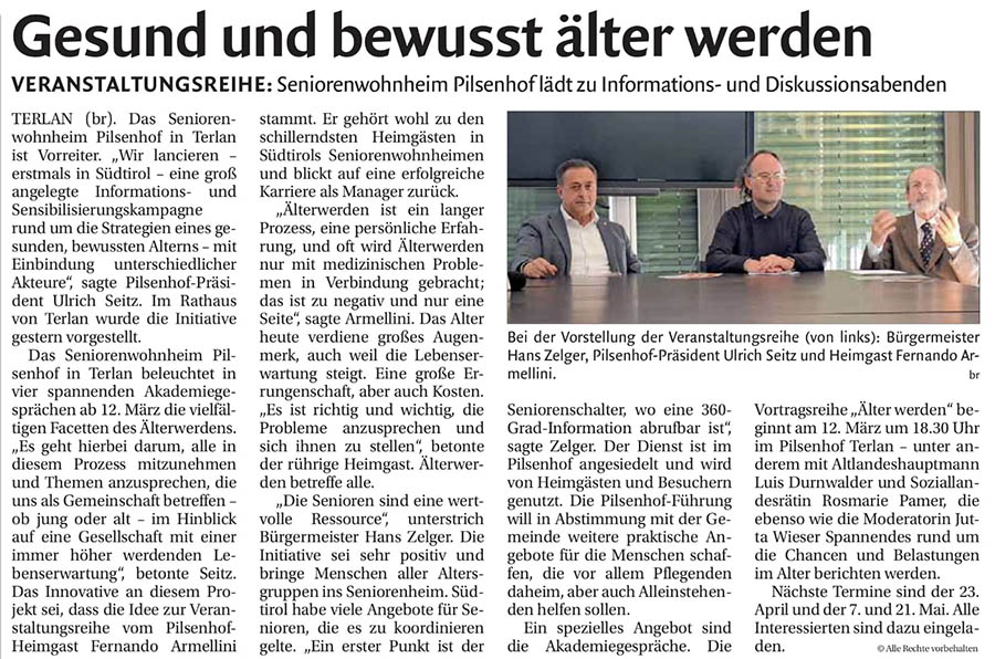 Es geht hierbei, alle in diesem Prozess mitzunehmen und Themen anzusprechen, die uns als Gemeinschaft ob jung oder alt im Hinblick auf eine Gesellschaft mit einer immer höher werdenden Alterserwartung betreffen, so Pilsenhof-Präsident Ulrich Seitz. Das Innovative an diesem Projekt ist, dass die Idee für die Reihe an Begegnungen mit diversen Persönlichkeiten, die Südtirol kennt, und die in ihrem Wirken einen wichtigen Beitrag für das Aufgreifen der zitierten Thematik rund um eine der oftmals mit enormer Besorgnis empfundenen Lebensphase in der Bevölkerung, leisten, vom Pilsenhof-Heimgast Fernando Armellini stammt.
