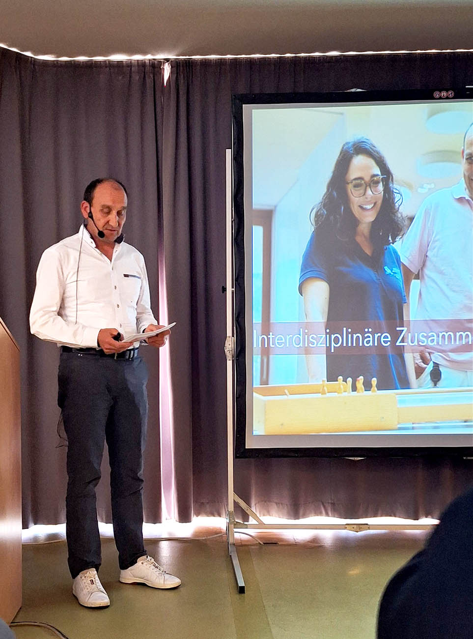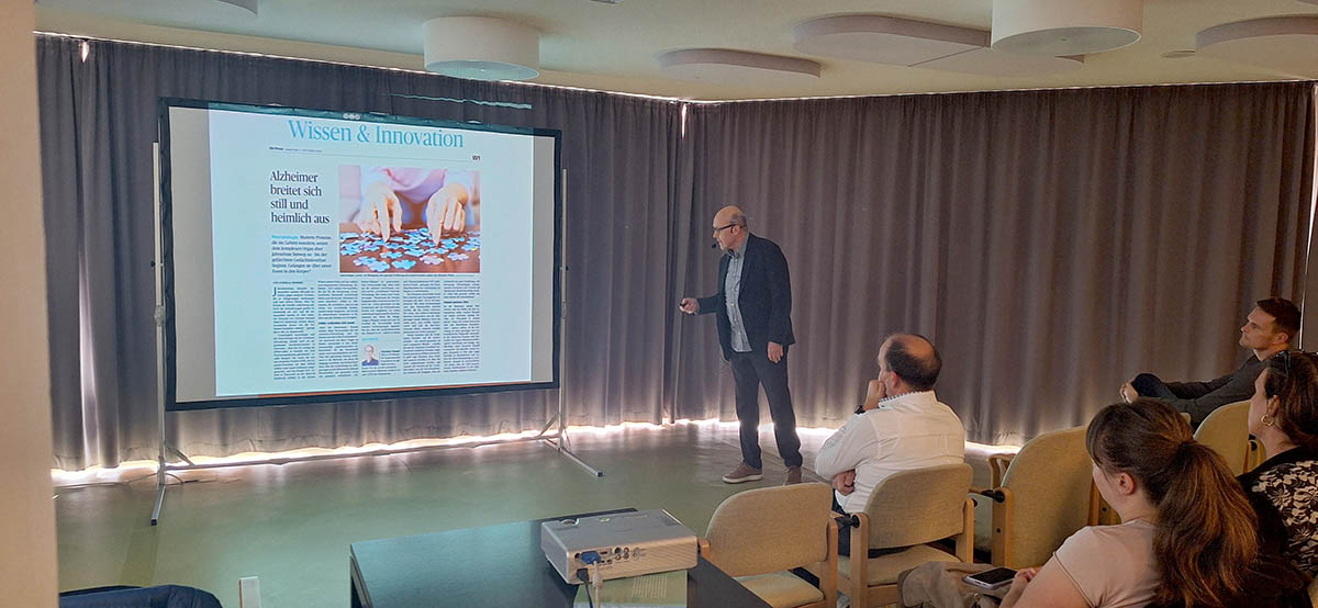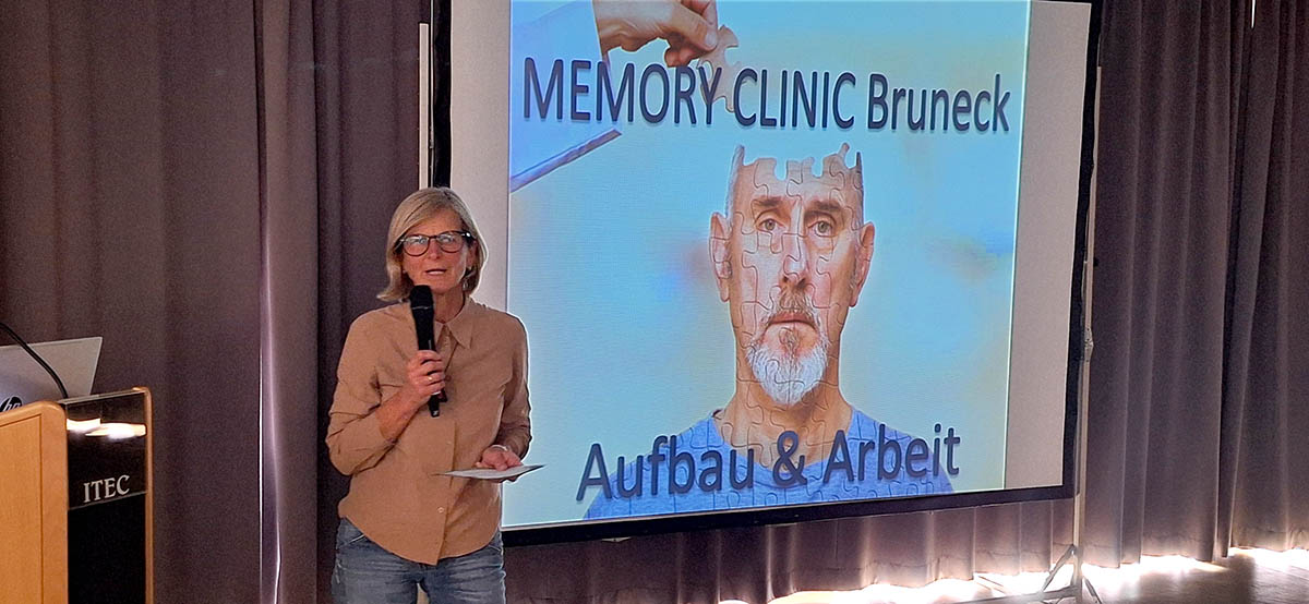 Der Primar der Neurologie des Krankenhauses Bruneck, Dr. Gregorio Rungger zeigte anhand vieler praxisnaher Beispiele, wie präsent Demenz und Alzheimer jetzt schon in unserer Gesellschaft sind und wie sich das zwangsläufig in den nächsten Jahren noch verstärken wird. Er appellierte an die Anwesenden, sich früh genug über Demenz zu informieren und bei auftretenden Symptomen rechtzeitig zur Abklärung zu gehen. „Wenn eine Diagnose früh genug gestellt wird, gibt es bereits jetzt Möglichkeiten, den Krankheitsverlauf zu verlangsamen, die Forschung ist hier auf einem guten Weg“, schilderte er in seinen Ausführungen. Zudem gebe es auch vieles, was Menschen präventiv gegen Demenz machen könnten. Zum Beispiel ein körperlich und sozial möglichst aktives Leben zu führen. Rungger betonte auch, dass Menschen, die an Demenz erkrankt sind, nicht mehr belehrt werden sollten. Betroffene müssten dort abgeholt werden, wo sie sind. Angehörige sollten Demenzkranken bestenfalls nicht widersprechen, sie nicht korrigieren und nicht versuchen mit ihnen Gedächtnistrainings zu machen.