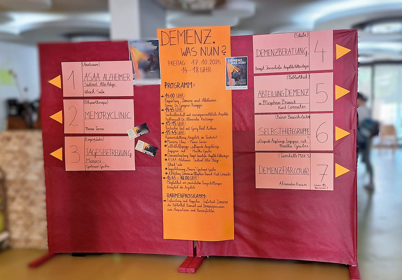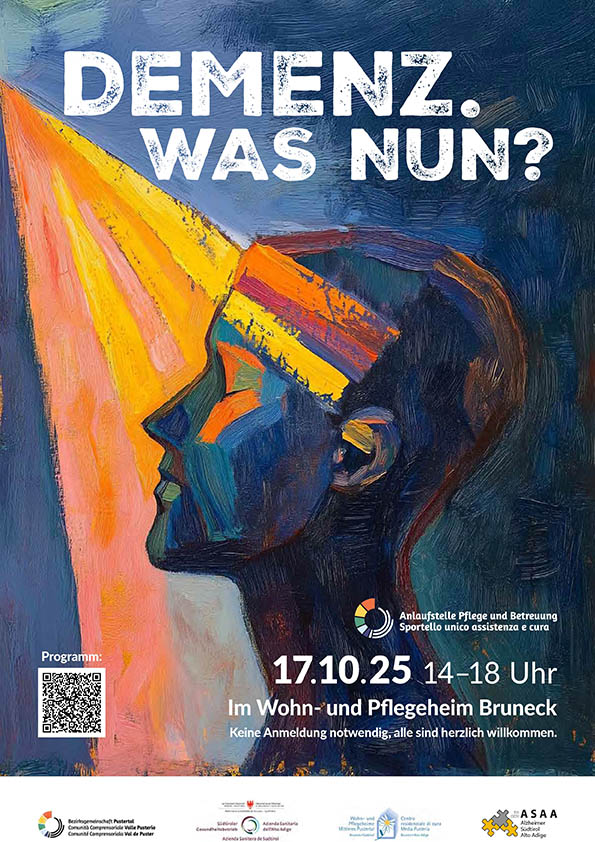 Am Freitag, 17. Oktober lud die Anlaufstelle Pflege und Betreuung der Bezirksgemeinschaft Pustertal, des Wohn- und Pflegeheims Bruneck und des Gesundheitsbezirkes Bruneck zu einer Veranstaltung rund ums Thema Demenz. Zwischen 14 und 18 Uhr gab es im Wohn- und Pflegeheim Bruneck für die rund 90 Anwesenden zwei Fachvorträge, eine Kurzvorstellung von den sechs größten Diensten rund um Demenz im Pustertal und im Anschluss dann auch noch die Möglichkeit für persönliche Fragestellungen bei den Mitarbeitenden der Dienste. Abgerundet wurde das Programm mit einem poetischen Text, einem Infotisch mit Fachzeitschriften und Lesematerial und mit einem kleinen Buffet. Insgesamt war es ein sehr gelungener und vor allem ein sehr informativer und hilfreicher Nachmittag.