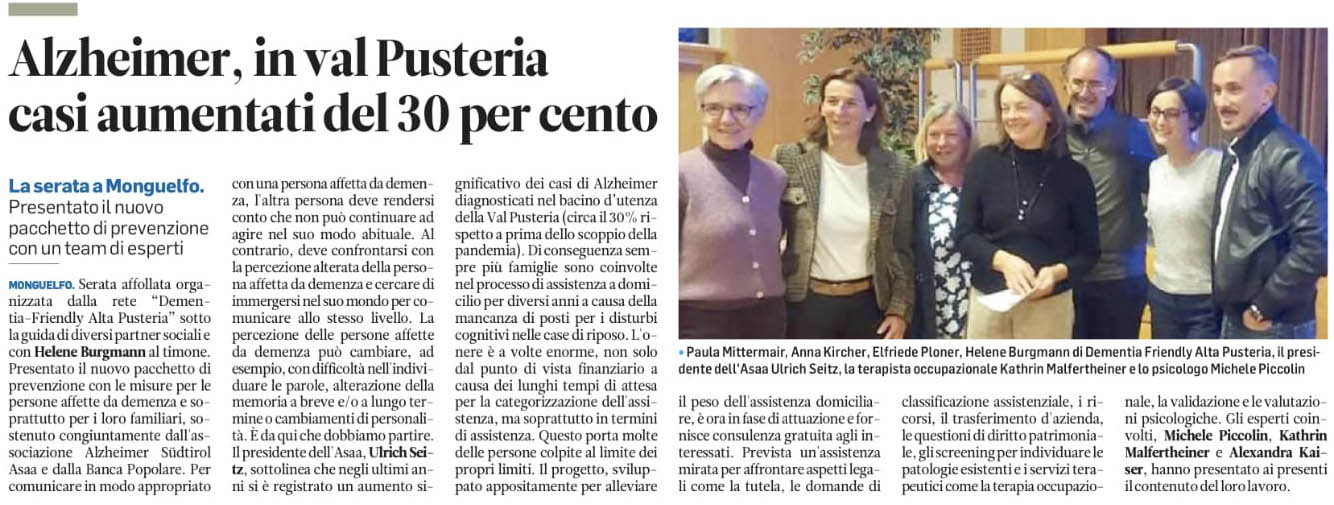 Nell’ambito di una serata informativa molto partecipata, organizzata dalla rete Dementia-Friendly Alta Pusteria sotto la guida di diversi partner sociali e con l’impegno di Helene Burgmann al timone, è stato recentemente presentato a Monguelfo il nuovo pacchetto di prevenzione e misure per le persone affette da demenza e soprattutto per i loro familiari, sostenuto congiuntamente dall’associazione Alzheimer Südtirol ASAA e dalla Banca Popolare.