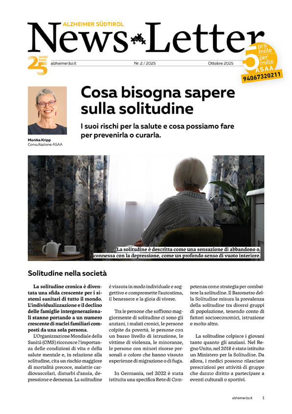 Download Newsletter Nr. 1 / 2022.pdfSempre più persone sono affette da disturbi cognitivi. Non tutti vogliono conoscere la causa della dimenticanza, delle limitazioni del linguaggio o dei disturbi dell’orientamento. Da un lato, questo può essere causato dalla malattia, per una mancanza di consapevolezza dei propri limiti, dall’altro, per la convinzione che non si può fare nulla perché non esiste ancora una cura.