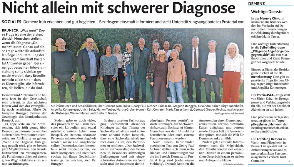 Demenz früh erkennen und gut begleiten - Bezirksgemeinscheft informiert und stellt Unterstützungsangeboteim Pustertal vor
